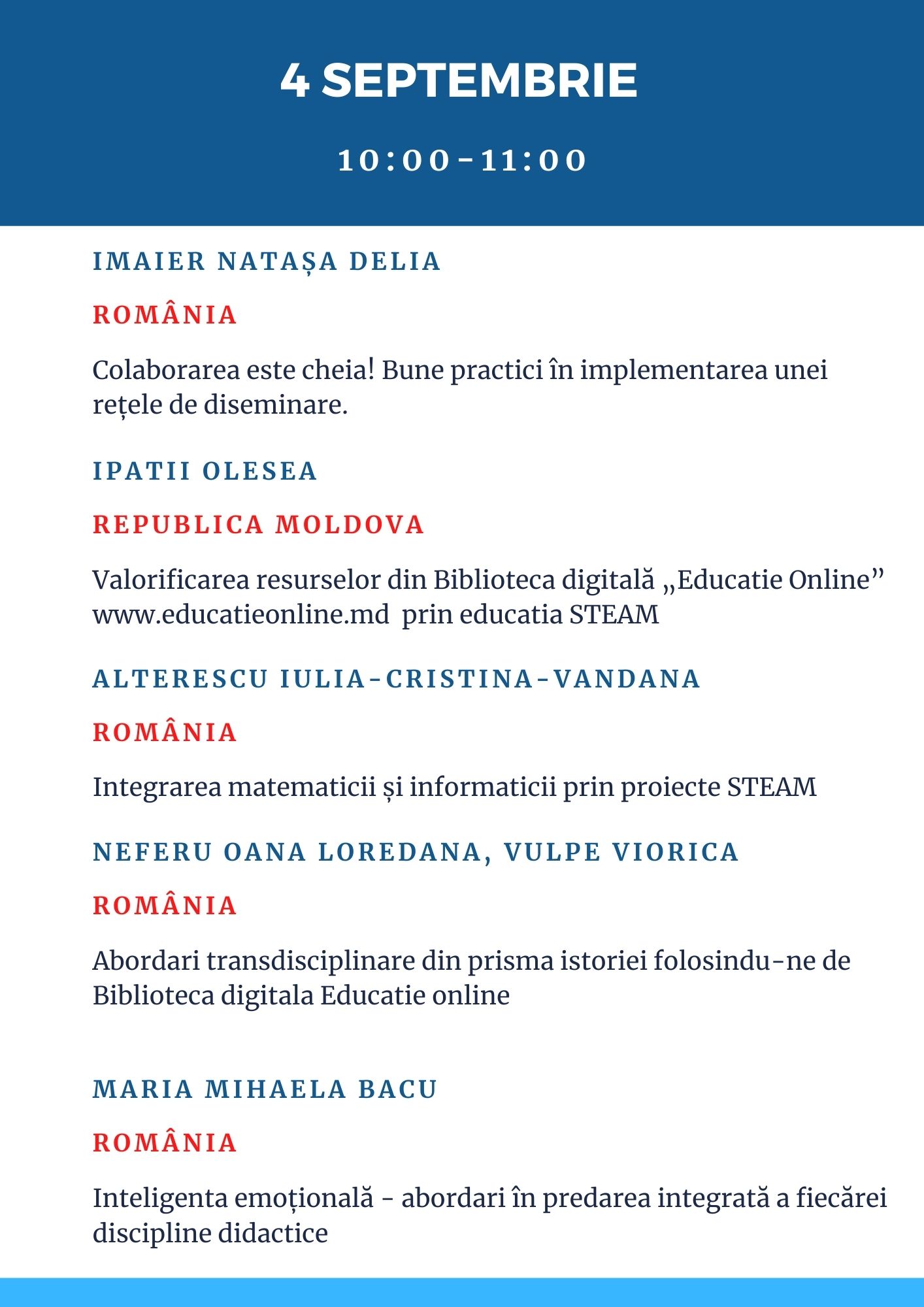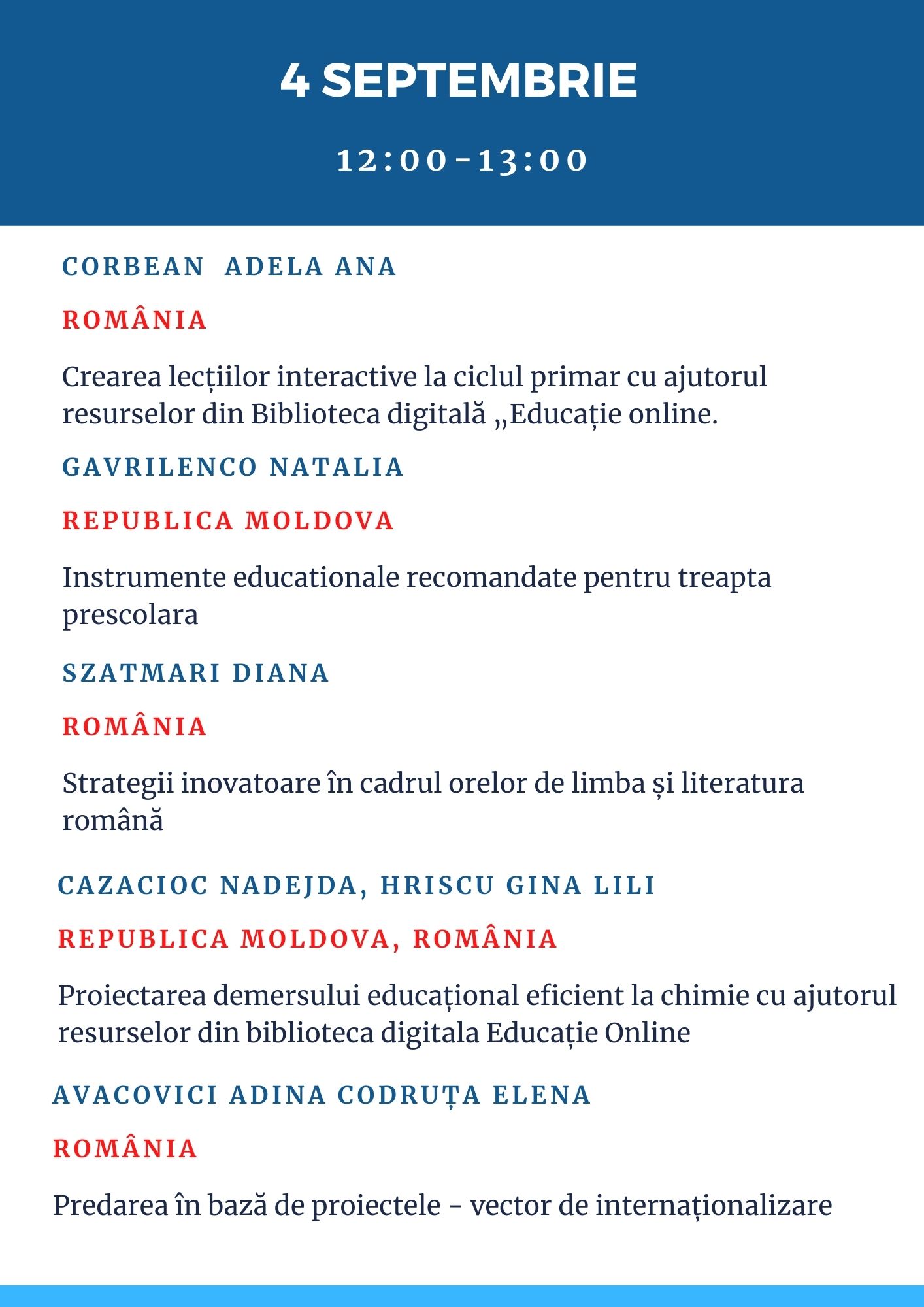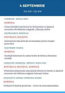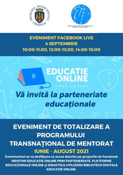 Sâmbătă, 4 septembrie, în intervalul 10:00-11:00, 12:00-13:00, 14:00-15:00 invităm cadrele didactice și manageriale la Evenimentul de totalizare a Programului transnațional de mentorat „Educație online prin parteneriate” desfășurat de Direcția Generală Educație, Tineret și Sport a Consiliului municipal Chișinău, care va prezenta cele mai de succes experiențe ale mentorilor și cadrelor didactice mentorate din Republica Moldova și România. Evenimentul se va desfășura cu acces deschis pe grupurile de Facebook MENTORI EDUCAȚIE ONLINE PRIN PARTENERIATE, PLATFORME EDUCAȚIONALE ONLINE și DIDACTICA UTILIZĂRII BIBLIOTECII DIGITALE EDUCAȚIE ONLINE.