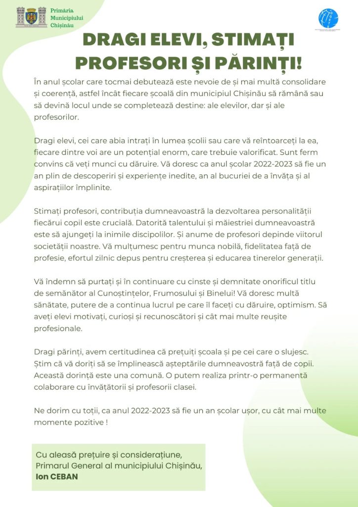 Mesajul Primarului General al municipiului Chișinău, Ion CEBAN, cu ocazia începerii noului an școlar, 2022-2023