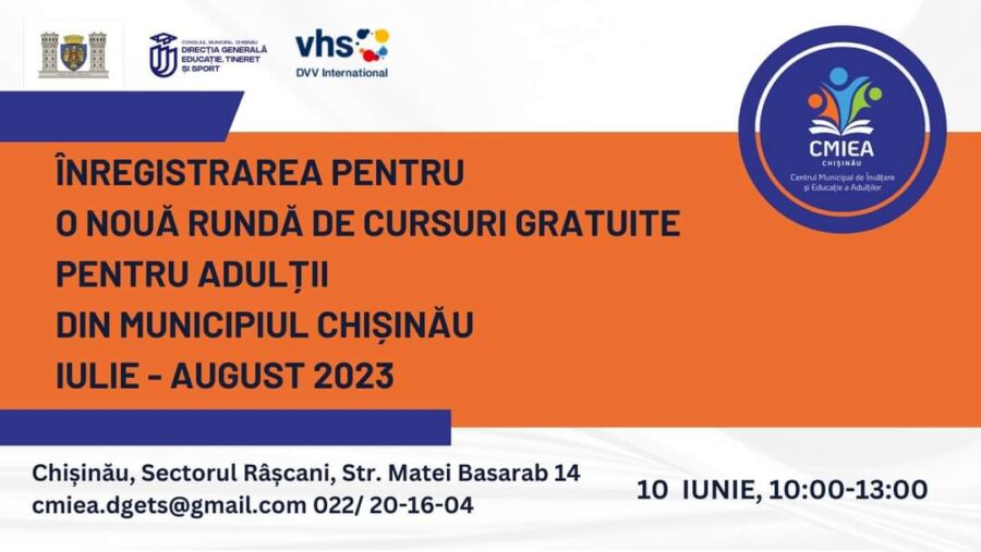 Primăria municipiului Chișinău și Direcția Generală Educație, Tineret și Sport în parteneriat cu DVV International Moldova anunță deschisă înregistrarea la o nouă rundă de cursuri de dezvoltare personală și profesională oferite de către Centru Municipal de Învățare și Educație a Adulților (Sectorul Râșcani, str. Matei Basarab, 14) pentru perioada iulie – august 2023.
