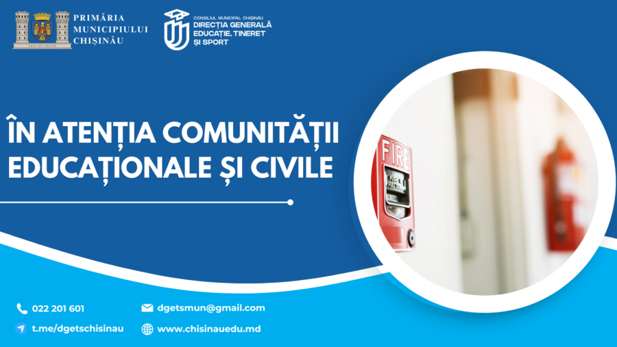 Direcția Generală Educație, Tineret și Sport a Consiliului Municipal Chișinău este dedicată asigurării unui mediu securizat în instituțiile de învățământ. În acest sens, vă informăm că în perioada lunilor aprilie – mai, Direcția situații excepționale municipiul Chișinău organizează și desfășură exerciții de evacuare a elevilor, cadrelor didactice și angajaților auxiliari din instituțiile de învățământ general.