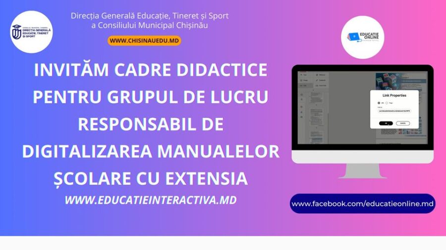 Direcția Generală Educație, Tineret și Sport a Consiliului Municipal Chișinău anunță lansarea unui proiect inovator și invită cadrele didactice din instituțiile de învățământ preșcolar, primar, secundar și extrașcolar din municipiul Chișinău și din întreaga republică să se alăture grupului de lucru responsabil de digitalizarea manualelor școlare cu extensia www.educatieinteractiva.md. ![]()