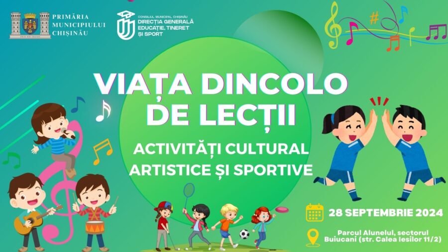 Direcția Generală Educație, Tineret și Sport a Consiliului municipal Chișinău invită toți doritorii sâmbătă, 28 Septembrie 2024, în parcul Alunelul, sectorul Buiucani (str. Calea Iesilor 11/2) în intervalul orelor 11:00 – 15:00, la activitatea publică cu genericul: „Viața dincolo de lecții”.