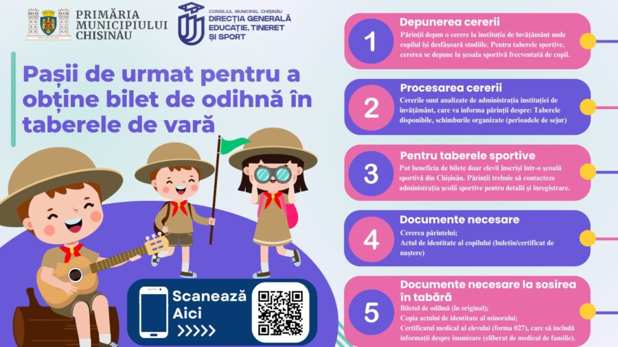 ℹ️📣 Direcția Generală Educație, Tineret și Sport a Primăriei Municipiului Chișinău informează părinții despre modul de obținere a biletelor pentru taberele de vară 2025